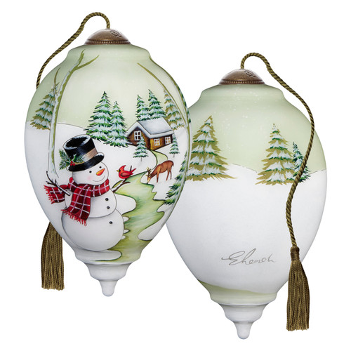 - Admiring the tranquil views before him, a top hat wearing snowman visits with a cardinal friend while a deer quietly roams the snow-kissed landscape.