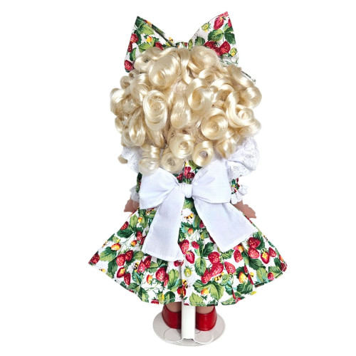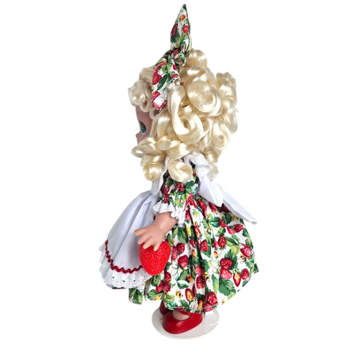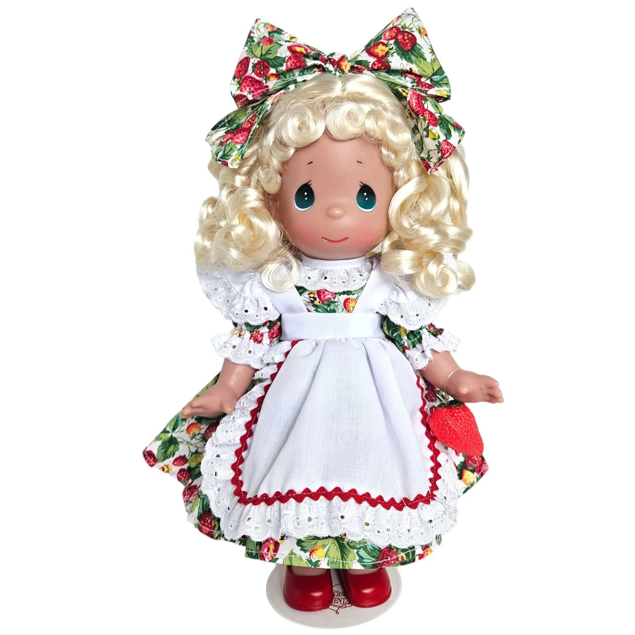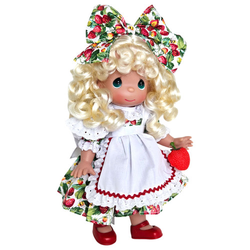 • Dressed in a strawberry themed dress with a crisp white apron, she’s ready for garden parties, picnics, and warm-weather memories.