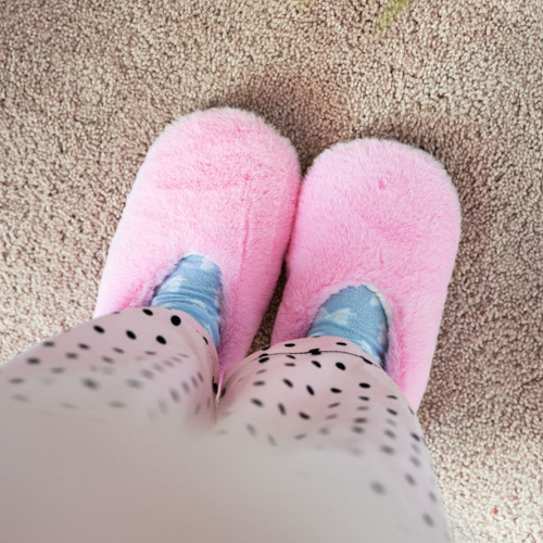 - Slippers are one size fits most. Made of soft plush and fabric. Handwash only.